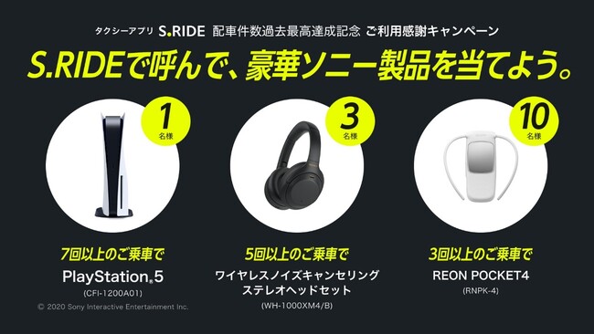 S.RIDEで呼んで、PlayStation(R) 5 など豪華ソニー製品が抽選で当たる!タクシーアプリ「S.RIDE(エスライド)」ご利用感謝キャンペーンを実施