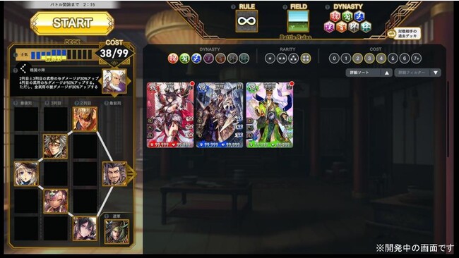 本作はカードを使った1対1の対戦ゲームです。『三国志大戦』のエッセンスを活かしながら、3分でデッキを編成する「Instant Deck Card Battle」としてゲームデザインを新しく構築しています。