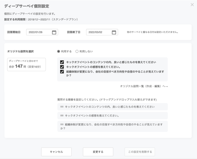 オリジナル設問を追加した場合の合計質問数と目安時間が表示されます