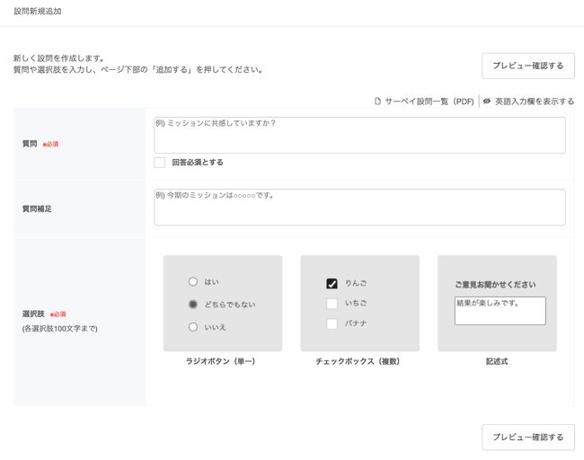 『ラフールサーベイ』内に内包されている2種類のサーベイ、「ショートサーベイ」「ディープサーベイ」に追加できるオリジナル設問が従来各々1問のみでしたが、今回の追加実装により複数追加が可能となります。さらに回答の選択方法も「記述式」「単一選択」「複数選択」の3種類から選べるようになります。