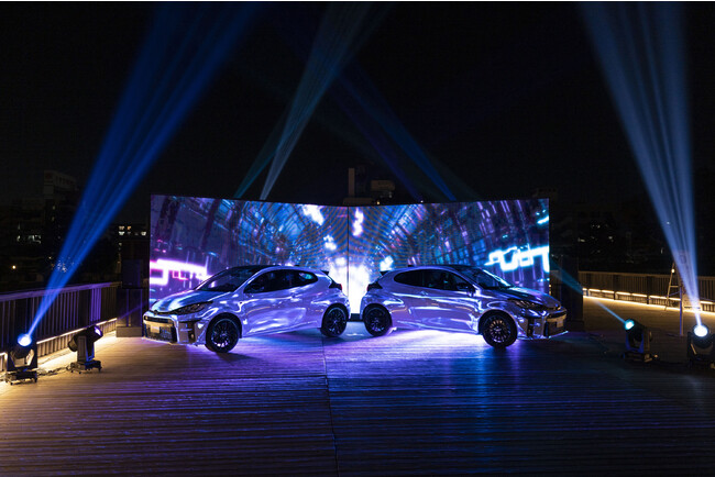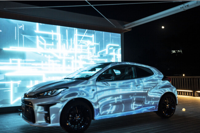 この催しは、「FORUM8 Rally Japan 2022」とのコラボレーションイベントで、2020年に完成した岡崎市の新名所「桜城橋」にディスプレイされた3台の「トヨタ GRヤリス」の車体に、疾走感のあるデジタルアートコンテンツなどのプロジェクションマッピング映像を投影しました。