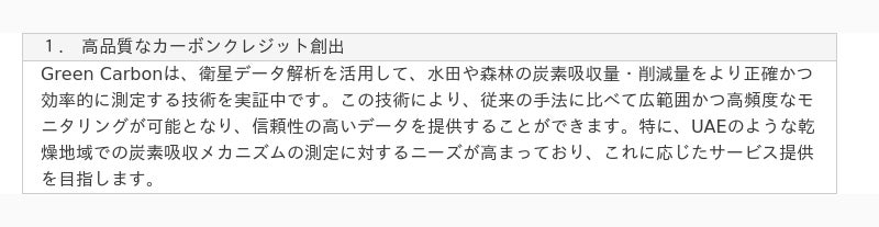 ネイチャーベースのカーボンクレジット創出販売事業を展開するGreen Carbon株式会社(代表取締役:大北潤、以下Green Carbon(読み;グリーンカーボン))は、2024年12月12日(火)にアラブ首長国連邦(以下、UAE)のアブダビで開催された、経済産業省宇宙産業課主催の「日UAE宇宙官民ワークショップ(以下、本イベント)」に登壇したことをお知らせします。本イベントでは、自然由来のカーボンクレジット創出プロジェクトや、クレジット創出における衛星データの活用について、中東地域の約4,568万ha※1の農地ポテンシャルの可能性を紹介しました。