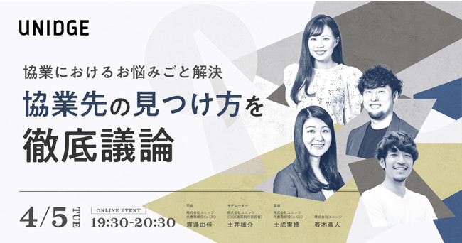 本キャンペーンの実施に伴い、4月5日(火)にオンラインセミナー「協業におけるお悩みごと解決〜協業先の見つけ方を徹底議論〜」を開催します。UNIDGEのメンバーが、協業支援サービスの提供経験を踏まえ、協業先の見つけ方のポイントをご紹介します。