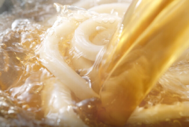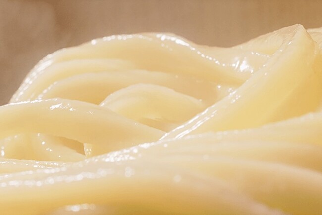 打ち立てのうどんは、お店でしか味わえない、茹で釜からどんぶりに直接入れる「釜抜き麺」でご提供します。「釜抜き麺」は、熱々で表面に少し毛羽立ちが残っているため、もっちりふわふわな食感。そこに旨みたっぷりのだしがよく絡み、打ち立てのうどんと特製だしの旨みを一緒に味わっていただけます。