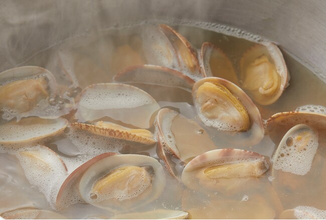 ご注文をいただいてから、北海道産の真昆布と厳選された複数の削り節からつくる風味豊かなかけだしをベースにあさりの旨みを加えた特製だしをたっぷりと注ぎ、殻付きあさりをごろっと手鍋に入れて、旨みを引き出しながら火をいれます。