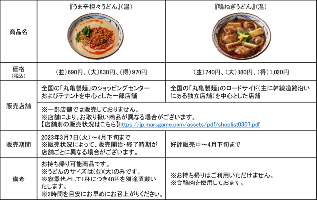 他、ショッピングセンターなどの一部店舗で『うま辛担々うどん』を同期間中に販売いたします。さらにお客さまからのご好評につき『鴨ねぎうどん』を、2023年4月下旬まで延長して販売することが決定いたしました。