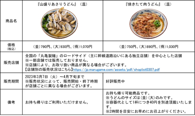 丸亀製麺の2つの人気商品をお楽しみいただける、この春。今日は、ほっこり『山盛りあさりうどん』にしようか。明日は、がっつり『焼きたて肉うどん』にしようか。どちらの商品を食べようかと迷う時間もお楽しみいただけたらと思います。