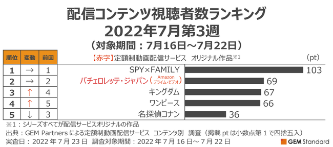 エンタテイメント業界に向けたデータ×デジタルマーケティングサービスを提供するGEM Partners株式会社(ジェムパートナーズ、所在地:東京都港区、代表取締役:梅津文)は7月29日(金)、複数の定額制動画配信サービスを横断して集計した2022年7月第3週の「配信サービス視聴者数ランキングTOP20(調査対象期間:7月16日〜7月22日、調査対象:日本在住15〜69歳男女)」を発表します。