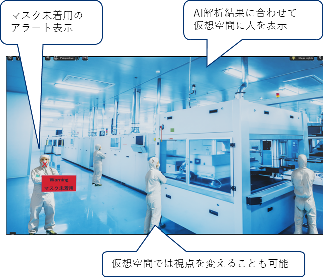 「産業用メタバース活用支援ソリューション」は、工場や店舗など遠隔地の状況をAIカメラで撮影し、そのデータをリアルタイムで仮想空間(メタバース)に反映することで安全性や効率性の向上に貢献するソリューションです。今回、NVIDIA Omniverse(TM)とIPC1047Eを活用することで、利便性を高め機能を向上させました。