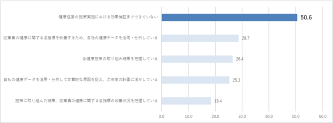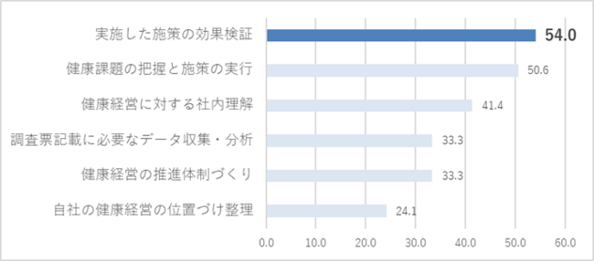 健康経営の推進において「効果検証」を課題と捉える企業・団体も半数以上にのぼる。