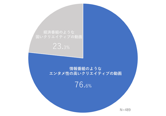 動画で発信される社内広報で、「経済番組のような固いクリエイティブ」「情報番組のようなエンタメ性の高いクリエイティブ」どちらが、社内広報への好意醸成がなされるかという質問では、「エンタメ性」が求められているという結果となった。