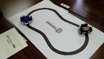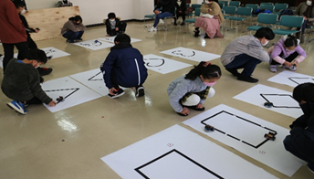 これらプログラムの基本構造について学習した後、Smart Cutebot底面の前方2箇所についている、ライントレースセンサを用いて、黒い線の上をなぞるように自動走行するプログラムの作成を、ヒントを交えつつ児童に考えさせながら進めました。プログラムを組めた児童には、Smart Cutebotに付属で用意された、ライントレース基本経路の用紙にかかれた黒い線の上を自動で走行するプログラムが実装できたかどうか確かめてもらいました。今回、基本経路のほか応用経路を12種類用意し、基本経路の自動走行プログラムを組めた児童には、応用経路の自動走行プログラムの作成にチャレンジしてもらいました。児童は応用経路から好きな経路を選び、ラインの上を周回できるまで、試行錯誤でプログラムのデバッグ作業に夢中になっていました。
