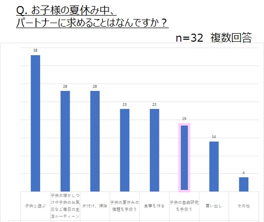さらに、夏休み期間中に夫(パートナー)に求めることは「子どもと遊ぶ」という回答が最も多くなりました。家事や食事作り、寝かしつけなどよりも、パートナーには子どもを遊ぶことを求めるママの姿が見える結果となりました。