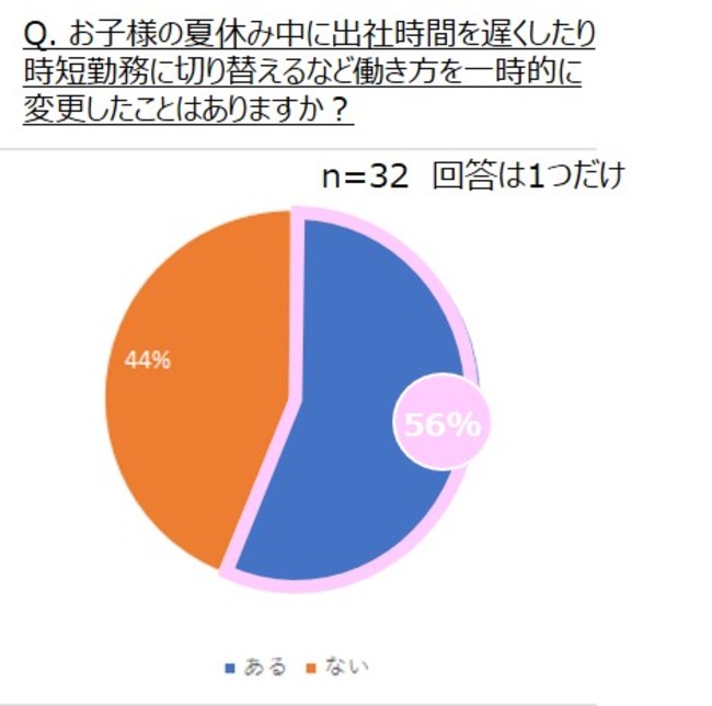 子どもの夏休みに合わせ、出社時間を遅らせたり時短勤務に変更するなど働き方を変えた経験があると回答したママは半数以上の56%となりました。