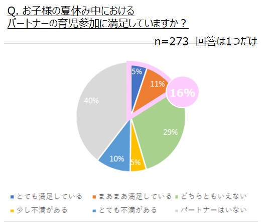 子どもの夏休み期間における、夫(パートナー)の育児参加について聞いたところ、「とても満足している」「まあまあ満足している」を合わせても満足している方はわずか16%と2割に満たない結果になりました。