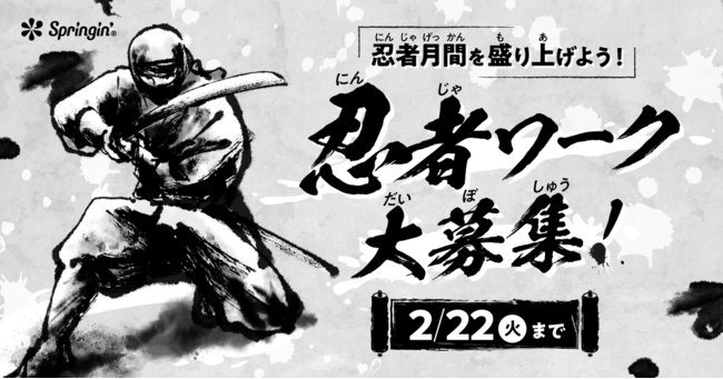 そこで、「Springin'(スプリンギン)」では「忍者月間」にちなみ、「忍者」をテーマにした作品を大募集しております。忍術を駆使したアクションゲームや、屋敷からの脱出ゲームなど、忍者にまつわる作品であればなんでもOKです。みなさんの個性豊かな作品をお待ちしております!