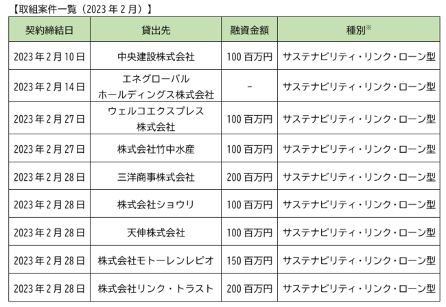 千葉銀行(頭取 米本 努)は、2023年2月に以下の事業者さまに対して「ちばぎんSDGsリーダーズローン」を取り組みましたので、お知らせします。