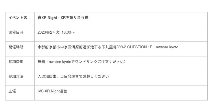 しかし「日本を世界一のXR先進地域にする」というモットーの元開催されるイベントなのに熱意のある人が来れないなんてもったいない!という想いで開催が決定されたのが「裏XR Night」です。
