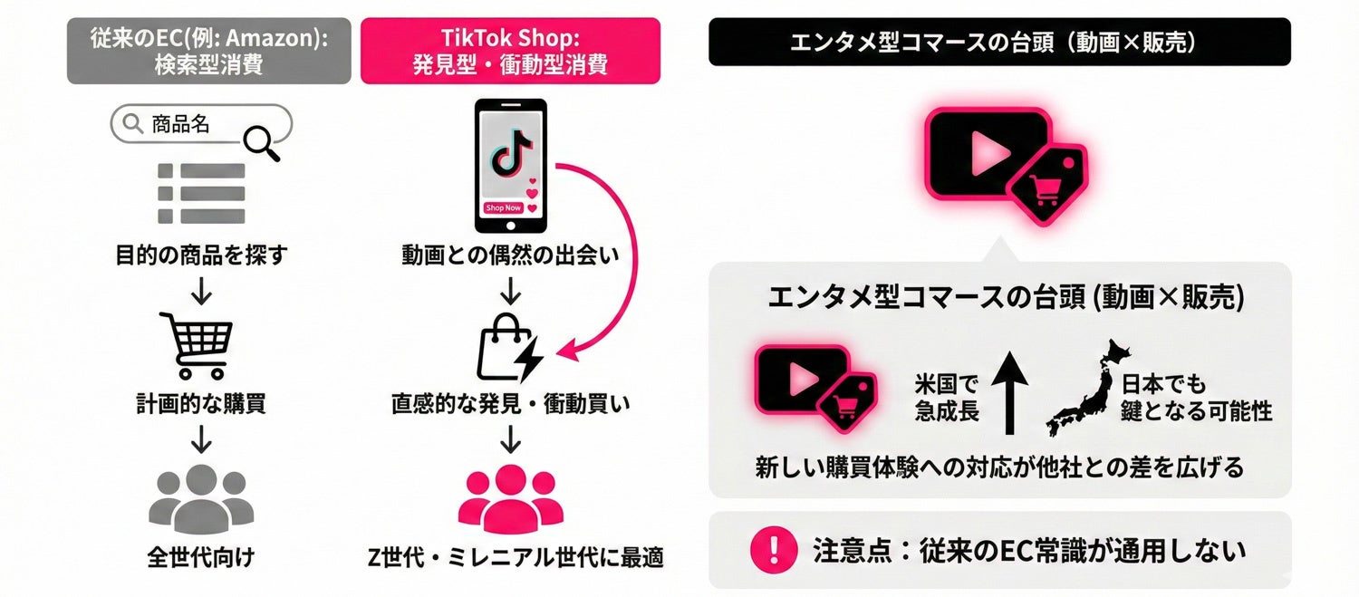 「Amazon=検索型消費」「TikTok Shop=発見型・衝動型消費」とされており、Z世代・ミレニアル世代にリーチするならTikTok Shopが最適と評価されています(※)。