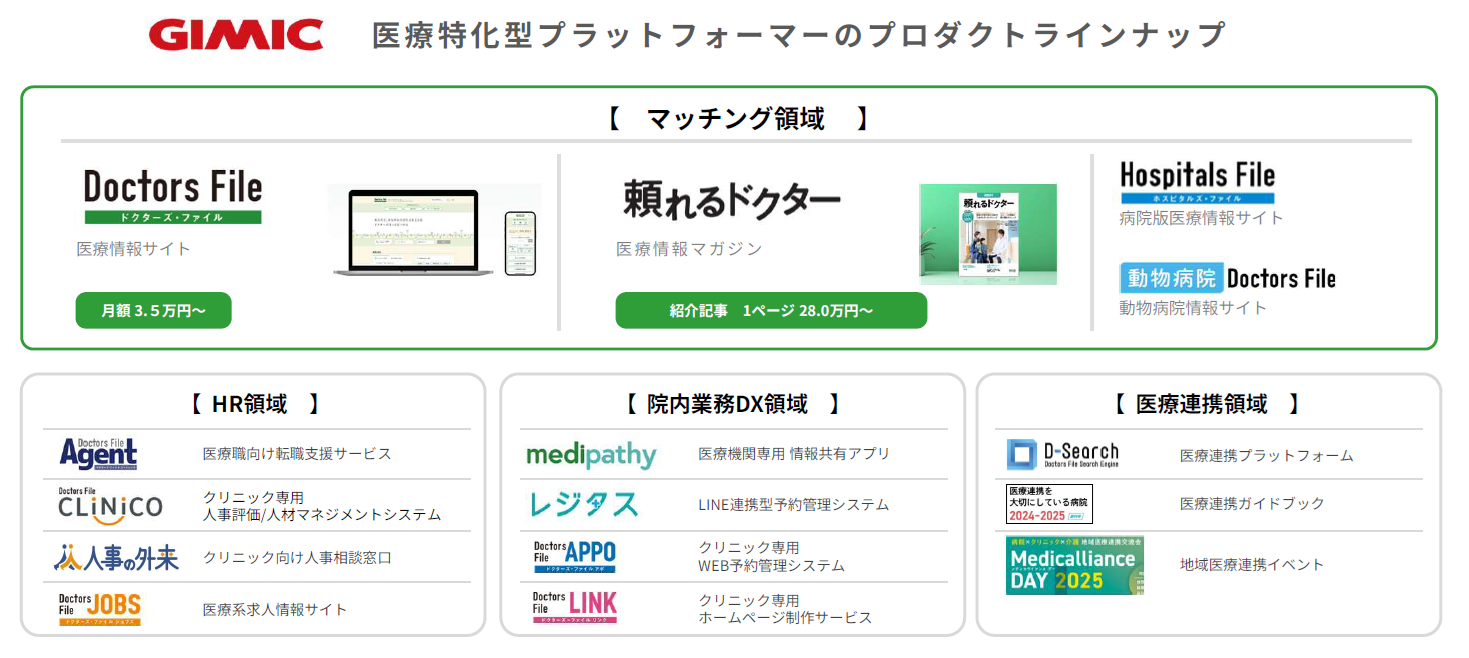 主力サービスは、患者にとって最適なかかりつけ選びをサポートする医療情報サイト「ドクターズ・ファイル」、医療情報マガジン「頼れるドクター」。その他、医療機関専用情報共有アプリ「ドクターズ・ファイル メディパシー(medipathy)」、クリニック専用人事評価/人材マネジメントシステム「ドクターズ・ファイル クリニコ(CLINICO)」、医療系求人情報サイト「ドクターズ・ファイル ジョブズ(JOBS)」など、医療特化型のプラットフォームを展開。
