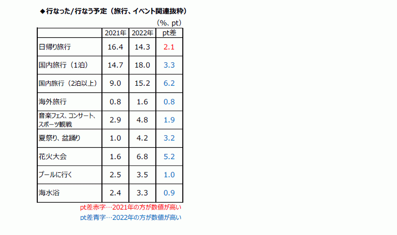 これが今年は様相が変わります。“行なう予定”比率をみると、「国内旅行」は「1泊」18.0%、「2泊以上」15.2%と昨年より各3.3・6.2ポイント上昇、“見合わせる予定”の比率も1桁台に低下しています。一方で「日帰り」は昨年より2.1ポイント低下しており、宿泊を伴う旅行にシフトしていることがわかります。また「友人、知人との外食・飲み会」も、昨年は7.7%とランク外だったのが10.8%に向上し、家族以外とのアクティビティも再開傾向に。さらにイベント関連でも、昨年比で「花火大会」5.2ポイント、「夏祭り、盆踊り」3.2ポイント、「音楽フェス、コンサート、スポーツ観戦」1.9ポイントそれぞれ昨年を上回り、有観客化の進展に伴って参加意欲が高まっているようです。