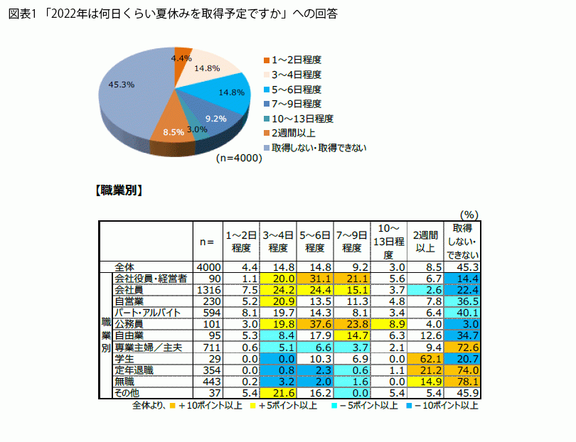 まず基本的なこととして、【今年は何日くらい夏休みを取得する予定なのか】を聞いたところ(図表1)、45.3%と最多だったのが「取得しない・できない」。もっとも、回答には定年退職者や主婦/主夫が含まれるため、数字が大きく出ている側面もあります。取得予定をみると、「3〜4日程度」「5〜6日程度」がともに14.8%、これに少し長めの「7〜9日程度」9.2%が続きました。ゆったり派の「10〜13日程度」「2週間以上」が合計で1割強、「1〜2日程度」と少ない人も4.4%いました。職業別では、1週間程度(「5〜6日程度」+「7〜9日程度」)は “公務員” が61.4%と最多、これに “会社役員・経営者” 52.2%、“会社員” 39.5%が続きました。片や、“自営業者” “パート・アルバイト” “自由業”で1週間程度休めるのは各24.8%、22.4%、32.6%どまりに。組織に属する人のほうがしっかりと休みは取りやすいようです。「取得しない・できない」では“専業主婦/主夫”が72.6%と高いのが目を引きます。子育て世代だと「子どもの在宅時間が長くなって、食事の準備などが増える」という話もあるように、夏は逆に忙しくなる人も多いのではないでしょうか。