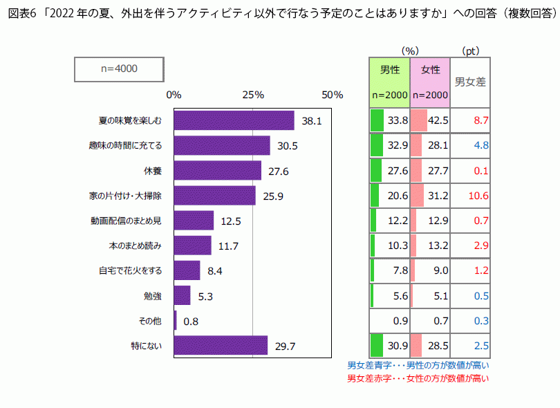 男女別では、「夏の味覚を楽しむ」は男女ともトップですが、2位は男性「趣味の時間に充てる」、女性「家の片付け・大掃除」と違いがあり、特に「家の片付け・大掃除」は10ポイント以上の差が生じています。なお、「休養」は男女間に差がないというのは興味深いところです。
