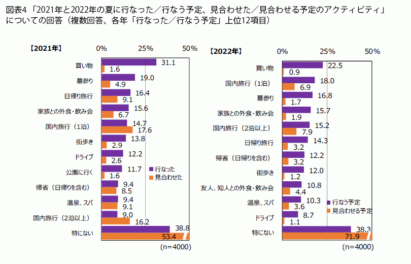 さらに、昨年(2021年)と今年(2022年)の夏について、行なった/行なう予定、見合わせた/見合わせる予定のアクティビティを聞いてみました(図表4)。昨年行なった項目の上位をみると、近場(「買い物」「街歩き」「公園に行く」)、短時間(「日帰り旅行」)、他者との接触を避ける(「家族との外食・飲み会」「墓参り」「ドライブ」)、の傾向が見て取れます。「国内旅行」では「1泊」「2泊以上」は“見合わせた”が“行なった”を上回っており、宿泊を伴う旅行には慎重な姿勢だったことがわかります。さらに、高齢者と接触する可能性がある「帰省(日帰りを含む)」や他者との接触の可能性がある「温泉、スパ」では両者が拮抗していました。