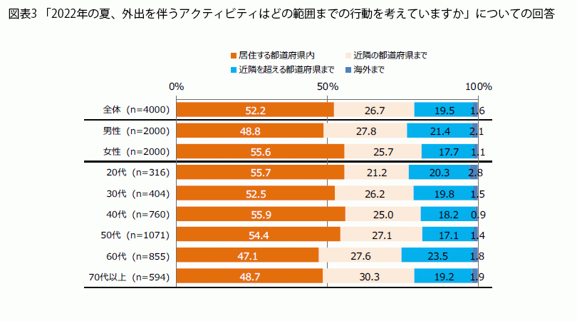 「過去2回の“コロナ下の夏”は遠出をせずに自宅近くで過ごしたので、今年はあれこれ計画を立てている」という人もいると思います。そこで今年の夏、外出を伴うアクティビティ(以下、アクティビティ)の行動範囲をたずねてみたところ(図表3)、52.2%と最も多かったのは「居住する都道府県内」というのは少し意外ですね。2位は「近隣の都道府県まで」26.7%となり、合わせて約8割の人が生活圏に近い範囲での活動にとどめる予定と。新型コロナだけでなく、最近の物価上昇も影響して、遠出を控えようという意識が強まっているのでしょうか。