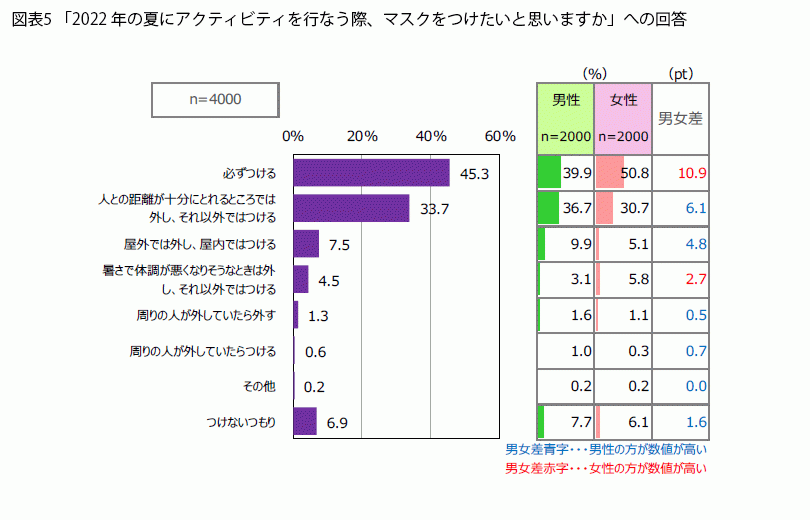 「熱中症予防の観点からも、屋外や屋内で他者と身体的距離が確保でき会話をほとんど行わない場合はマスク着用の必要がない」との方針が国から出されました。これを受けてか、マスクを外して歩いている人を見かけることも増え、“マスク生活”は転換点を迎えています。とはいえ、「感染がまだ心配」、はたまた「マスク生活に慣れて、素顔を見せるのが恥ずかしい…」と、マスクを外すことに抵抗感がある人もいそうです。では今年の夏、外出を伴うアクティビティの際にマスクをつけたいと思うかをたずねてみました(図表5)。