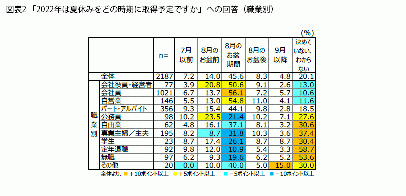 夏休みというと、“お盆の帰省ラッシュ”を思い浮かべますが、「7〜9月の間に〇日間」などのように個人の裁量で休みを取る職場も増えています。そこで、【今年はどの時期に夏休みを取得するか】を聞いてみたところ(図表2)、最多だったのは定番の「8月のお盆期間」45.6%。“会社役員・経営者” “会社員” “自営業”で過半数にのぼることから、お盆期間に夏休みを固定している職場がまだ多いということでしょうか。これに「8月のお盆前」14.0%、「8月のお盆後」8.3%が続き、約7割の人は8月中に夏休みを取得する予定のようです。近年注目されている「シルバーウィーク」(今年は9月17〜25日)を含む「9月以降」は4.8%と、「7月以前」7.2%を下回る結果に。子どもや家族の予定と合わせようとすると、9月に休みは取りずらい面もありそうですね。取得時期を「決めていない、わからない」人も2割に。“会社役員・経営者” “会社員” “自営業”では1割程度にとどまる一方で、“公務員”は27.6%と高いのは興味深いところです。