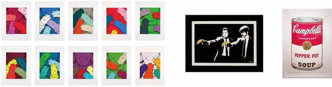 (左から)KAWS 《URGE》、Banksy 《Pulp Fiction》、Andy Warhol 《Campbell's Soup I (Pepper Pot)》