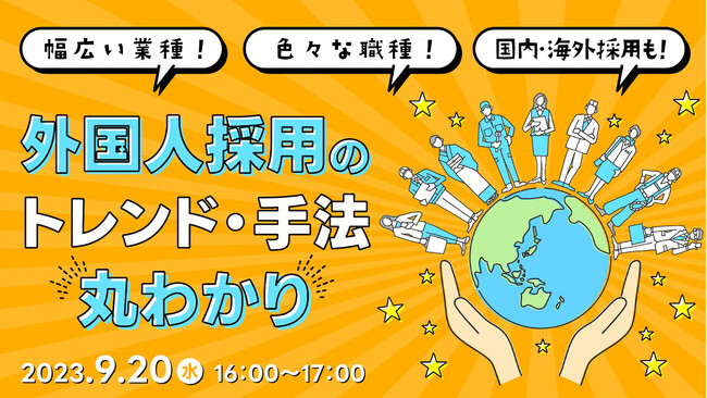 働くに関する社会課題をビジネスで解決するキャムコムグループの株式会社天職市場(本社:東京都新宿区西新宿、代表取締役:春名敬太、以下 天職市場)は、2023年9月20日(水) 16:00〜17:00に、外国人採用担当者向けオンラインセミナー『外国人採用のトレンド・手法丸わかりセミナー』を開催いたします。