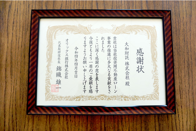 収益不動産を活用した資産運用コンサルティング事業を展開する大和財託株式会社(本社:東京都渋谷区/大阪府大阪市 代表取締役CEO:藤原正明、以下「当社」)は、令和4年4月21日に、オリックス銀行株式会社(本店:東京都港区 代表取締役社長:錦織雄一 以下「オリックス銀行」)より感謝状を授与いたしました。