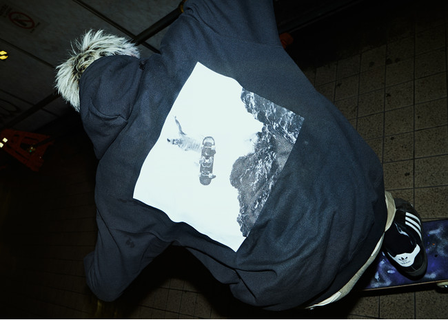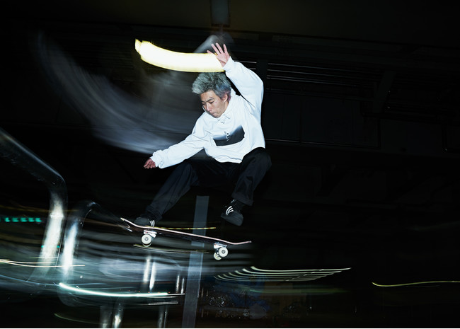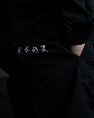 裸とスケートボード1 枚で自然と向き合う吉岡氏 自称ドブネズミ の姿を「ヌードとファッションの融合」 を自身のテーマとする UCHIDA 氏 がカメラを通して切り取り「ART×SKATE」の世界観を実現。そんな気迫あふれる数々の写真の中から厳選した4枚をフーディーに落とし込んだ。 (SKATE HOODIE 各 ¥9,900 袖や胸の「squeak squeak」ロゴは、吉岡氏自身が描いたものをプリントしている。「日本超鼠」刺繍の入ったパンツ・ジャケットは、スケート帰りにそのままディナーに出かけたい。という吉岡氏の想いを形にした。(JACKET ¥14,960 、PANTS ¥9,900)
