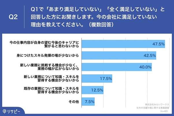 Q1で「あまり満足していない」「全く満足していない」と回答した方に、「Q2.今の会社に満足していない理由を教えてください。(複数回答)」(n=40)と質問したところ、「今の仕事内容が自身の望む今後のキャリアに繋がると思わないから」が47.5%、「身につけたスキル発揮の場が少ないから」が42.5%、「新しい業務に挑戦する機会が少なく、業務の幅が広がらないから」が40.0%という回答となりました。