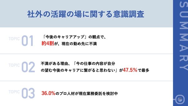 【プロ人材が求める社外の活躍の場に対する意識とは】約4割が、「キャリアアップ」の観点で現在の勤め先に不満あり 36.0%が、現在業務委託を検討中