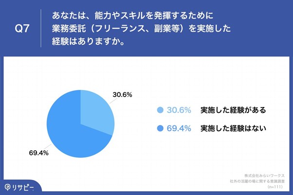 「Q7.あなたは、能力やスキルを発揮するために業務委託(フリーランス、副業等)を実施した経験はありますか。」(n=111)と質問したところ、「実施した経験がある」が30.6%、「実施した経験はない」が69.4%という回答となりました。