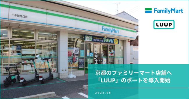株式会社Luup(本社:東京都渋谷区、代表取締役社長兼CEO:岡井大輝、以下「Luup」)は、電動マイクロモビリティのシェアリングサービス「LUUP」のポートを、株式会社ファミリーマート(本社:東京都港区、代表取締役社長:細見研介、以下「ファミリーマート」)が展開する京都市内のファミリーマート7店舗にて2022年6月1日(水)より導入します。尚、京都府のコンビニエンスストアで電動キックボードのポートを設置するのは今回が初となります。
