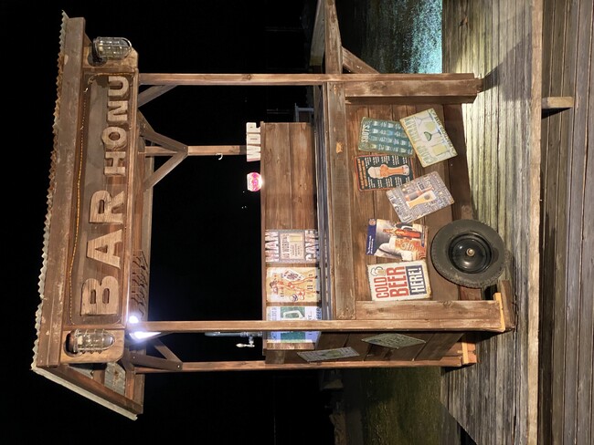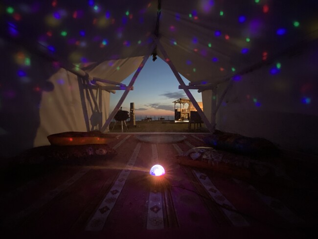 夕暮れ時、海辺のwood design park Nomaが、不思議な魅力に満ちた空間に包まれる。
