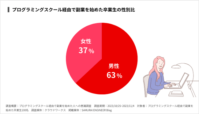 [1]プログラミングスクール経由で副業を始めた卒業生100名の性別比は、男性が63%、女性が37%
