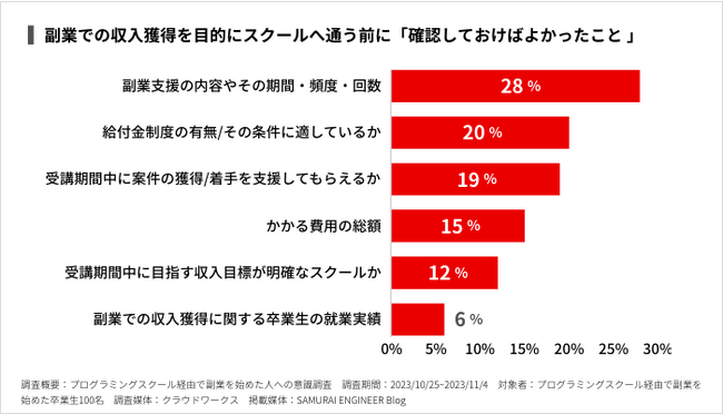 次に、副業での収入獲得を目的にスクールへ通う前に「確認しておけばよかったこと」を聞いたところ、「副業支援の内容やその期間・頻度・回数」が28%、「給付金制度の有無/その条件に適しているか」が20%、「受講期間中に案件の獲得/着手を支援してもらえるか」が19%、「かかる費用の総額」が15%、「受講期間中に目指す収入目標が明確なスクールか」が12%、「副業での収入獲得に関する卒業生の就業実績」が6%でした。