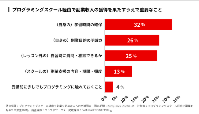 次に「プログラミングスクール経由で副業収入の獲得を果たすうえで重要なこと」を聞いたところ、「(自身の)学習時間の確保」が32%、「(自身の)副業目的の明確さ」が26%、「(レッスン外の)自習時に質問・相談できるか」が25%、「(スクールの)副業支援の内容・期間・頻度」が13%、「受講前に少しでもプログラミングに触れておくこと」が4%でした。