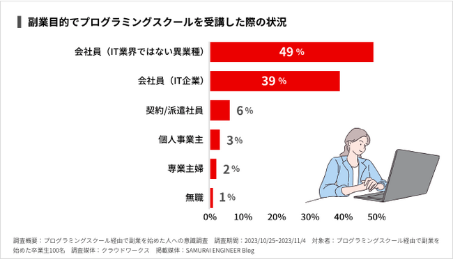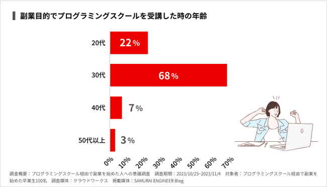 プログラミングスクール「侍エンジニア(SAMURAI ENGINEER)」を運営する株式会社SAMURAIは、プログラミングスクール経由で副業を始めた卒業生100名を対象に実施した「プログラミングスクール経由で副業を始めた人への意識調査」の結果を発表いたします。