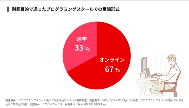 次に「副業目的で通ったプログラミングスクールで受講形式」を聞いたところ、オンラインが67%、通学が33%でした。