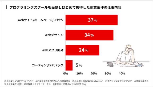 次いで「プログラミングスクールを受講し、はじめて獲得した副業案件の仕事内容」を聞いたところ、「Webサイト/ホームページ/LP制作」が37%、「Webデザイン」が34%、「Webアプリ開発」が24%、「コーディング/デバッグ」が5%でした。