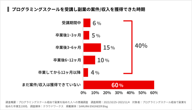次に「プログラミングスクールを受講し副業の案件/収入を獲得できた時期」を聞いたところ、40%は「受講期間中から卒業後にかけて」案件/収入を獲得できたと回答し、60%が「まだ案件/収入は獲得できていない」と回答しました。