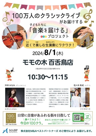 製造、建設、不動産、医療・ヘルスケア、物流、ITに特化したM&A仲介を行う株式会社M&Aベストパートナー(本社:東京都千代田区、代表取締役社長:齋藤 達雄 以下M&Aベストパートナーズ)と、一般財団法人100万人のクラシックライブ(東京都千代田区、代表理事:蓑田秀策 以下100万人のクラシックライブ)は、8月1日(木)10:30〜より、モモの木 百舌鳥店(大阪府)にて、クラシックライブを開催することをお知らせいたします。