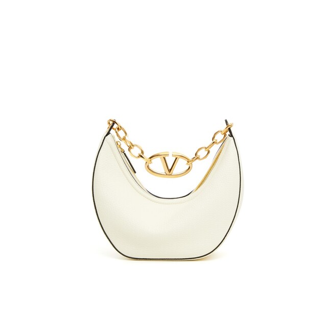 ポップアップストアの主役は、2024年スプリングコレクションの新作 ‘Vロゴ ムーン’ バッグです。三日月型のフォルムが特徴のこのバッグには、きらめくVロゴとメタリックチェーンがあしらわれています。チェーンを手首に巻いて持つとブレスレットのように輝き、デイウェアからイブニングルックまで幅広いスタイルを都会的でエレガントに演出します。