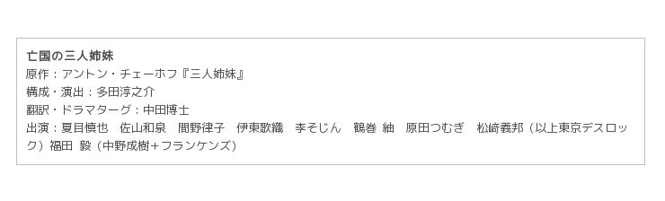 アントン・チェーホフの四大戯曲の一つ『三人姉妹』を、東京デスロック 最新作 『亡国の三人姉妹』として上演します。